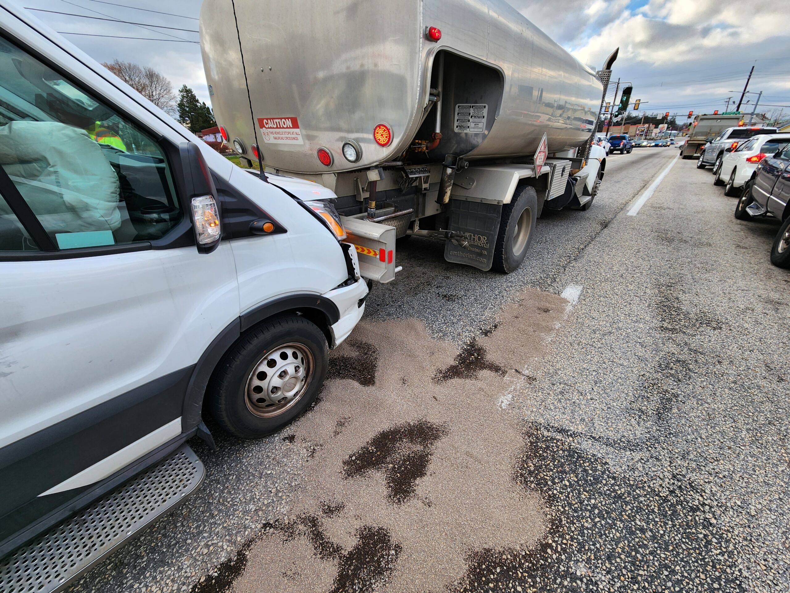 Engine 1-1 and Ambulance 1-8 were sent to the 1100 block of Lincoln Way East for a vehicle accident. En route, Communications advised a transport van into a fuel truck. Asst. Chief 1 arrived confirming dispatch. Crews evaluated the scene and found no fuel was leaking from the truck. Ambulance 1-8 checked on the occupants before clearing. Engine 1-1 controlled fluids from the van and blocked traffic until the arrival of CPD. The scene was turned over to police and Engine 1-1 cleared the scene.