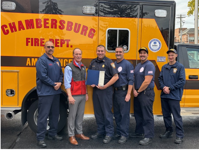 Congressman John Joyce stopped for a visit to the Headquarters fire station. He brought along with him a proclamation to recognize the Fire Department's 100th year of providing EMS service to the Borough of Chambersburg and the surrounding areas. We greatly appreciate the recognition, as well as the visist.