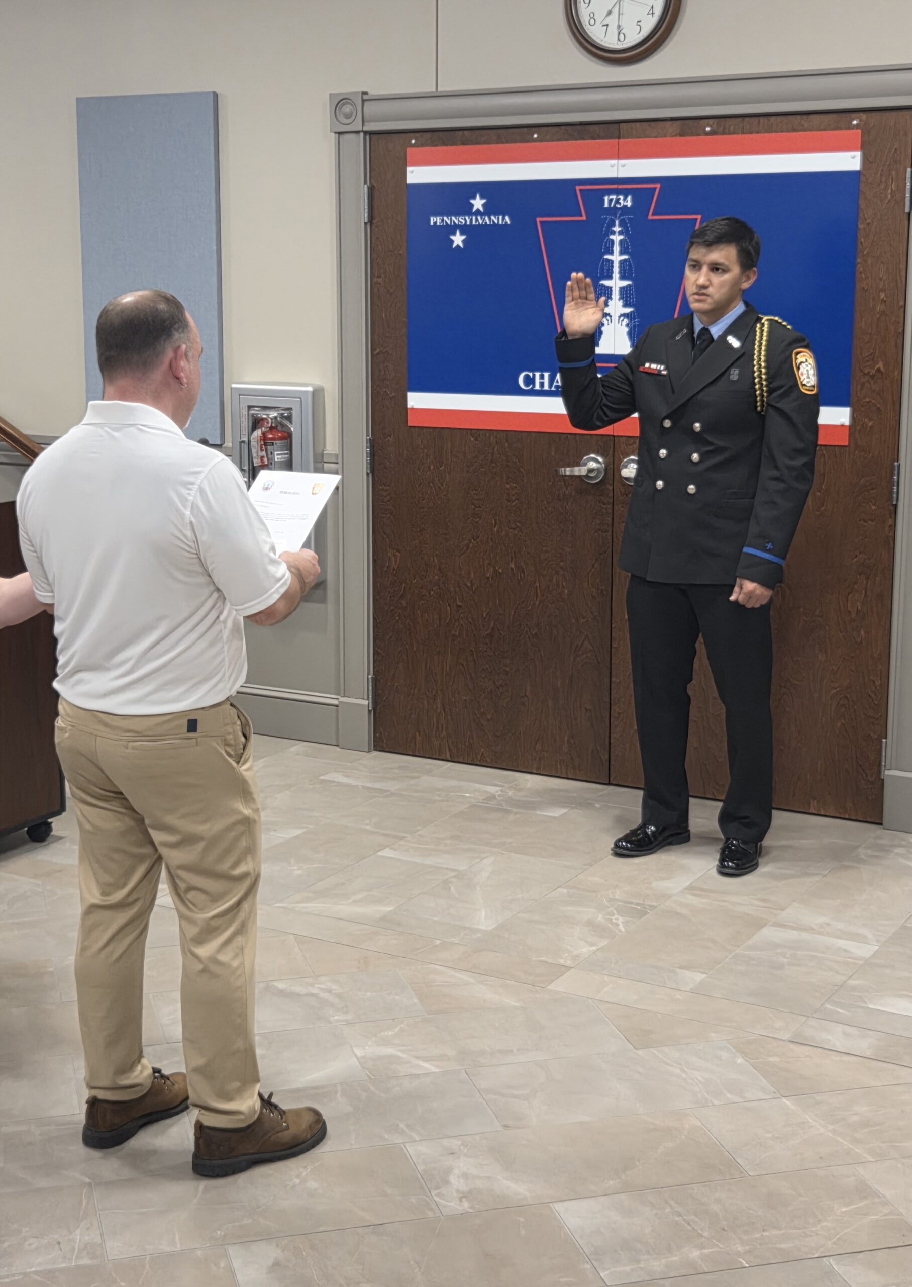 This evening, during the Borough Council meeting, Chambersburg Fire Department members were on hand to introduce FF/EMT Anthony Chen as the recommended candidate for the promotion to Fire Captain. The Borough Council unanimously approved the promotion, and after being sworn in, he officially became the new Captain of D Shift. Captain Chen was pinned during the meeting by his daughter.