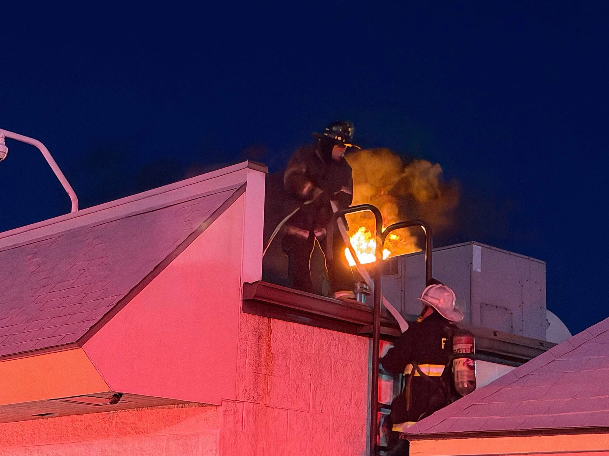 Tower 1 was alerted with the other 1st alarm assignment units to the 1900 block of Lincoln Way East in Fayetteville for a reported building fire. Engine 7-2 arrived on scene with smoke visible from the roof. Tower 1 arrived on scene and was assigned to access the roof. Crews located fire from a ventilation stack on the roof, assisting the Engine from 7 with attacking the fire.