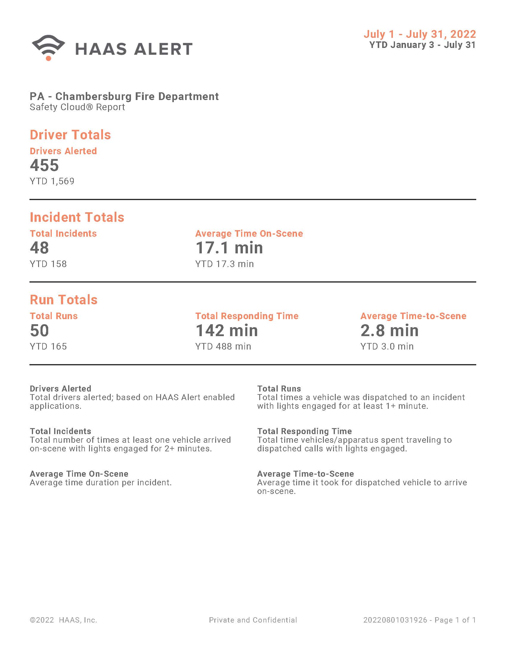 Chambersburg Fire Department received their monthly report from HAAS Alert on the effectiveness of our Emergency alert system in our newest Engine. For the month of July 2022, 455 drivers were alerted of a Chambersburg Fire Department vehicle approaching them or them approaching a unit on an emergency scene. This total of drivers altered occurred over 48 different emergency incidents the department handled for the month. Each day the department is fortunate that we are able to provide drivers an early notification of an approaching fire truck or incident scene aids in slowing down, pulling over and detouring so that emergency responders can respond safely.