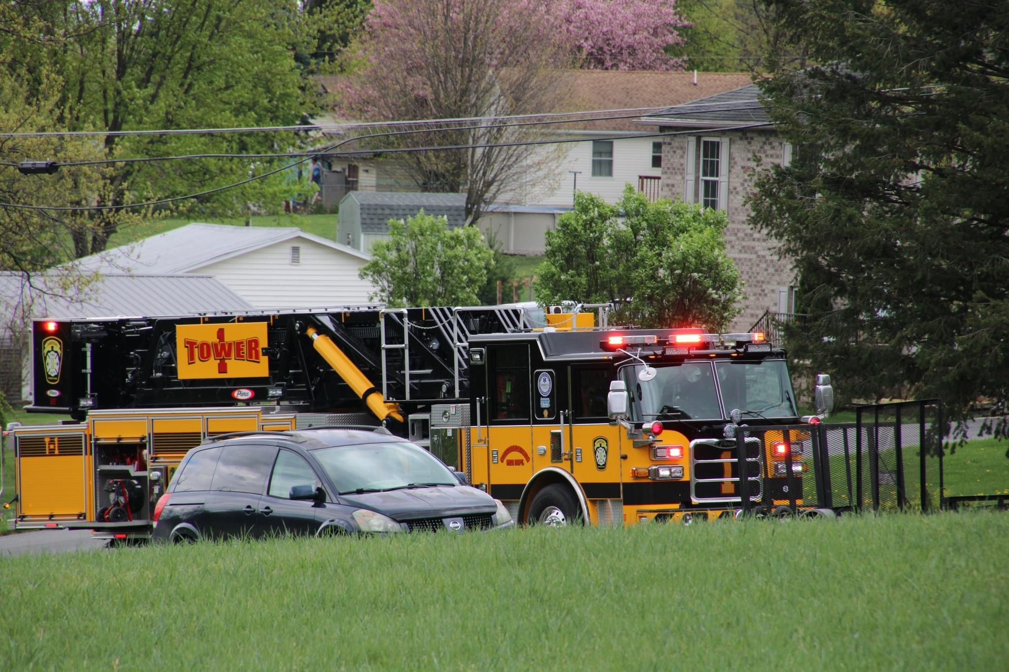 Tower 1 1 alerted to assist Pleasant Hall Fire on a shed fire at the 14000 block of Mountain Road. Company 11 units arrived with a working fire and began a fire attack. Tower 1 arrived and staged for a brief time until the crew was assigned to the attic space to check for further extension and overhaul. Crews assisted with positive pressure ventilation as well until being released by Command 11.