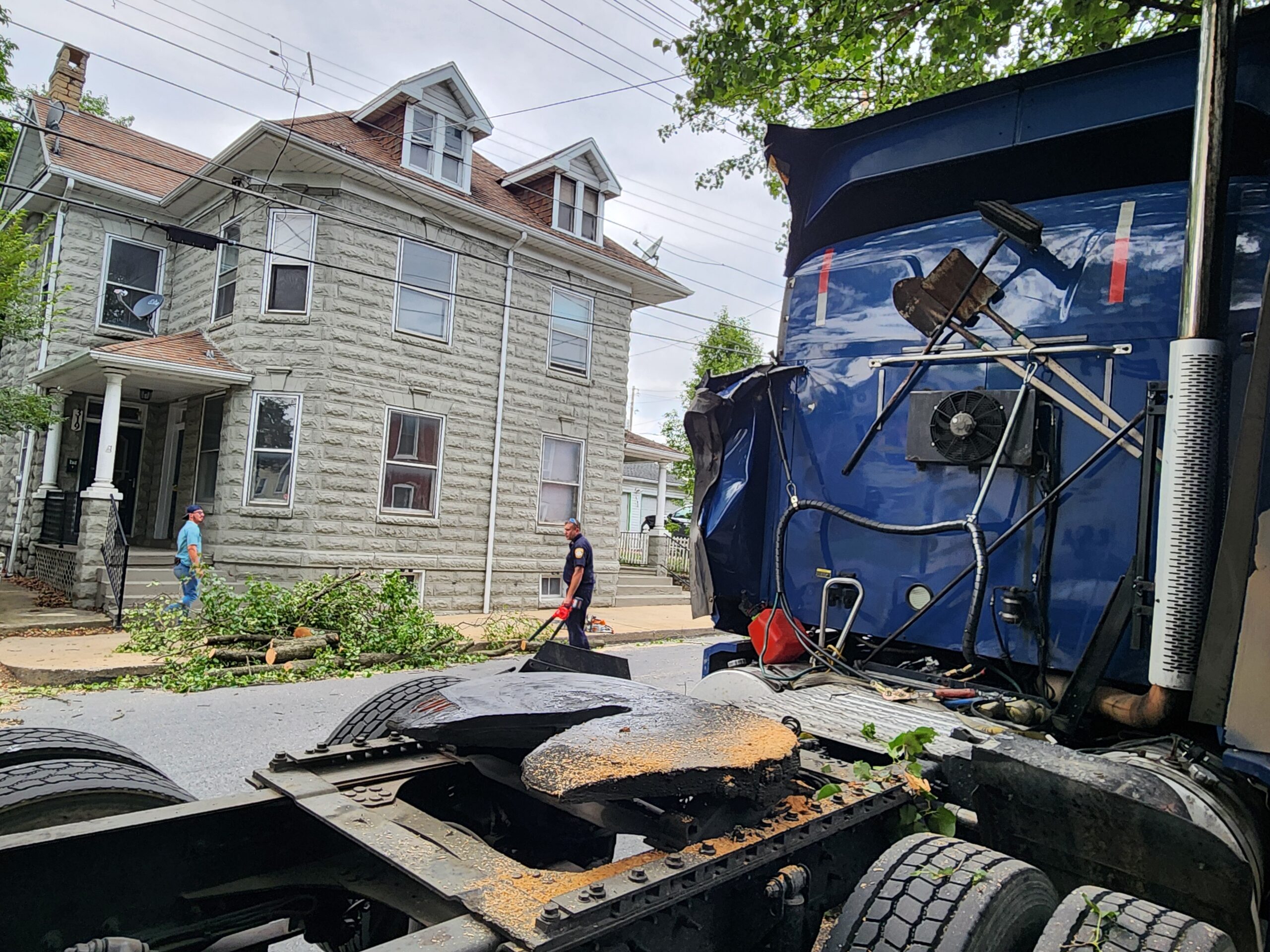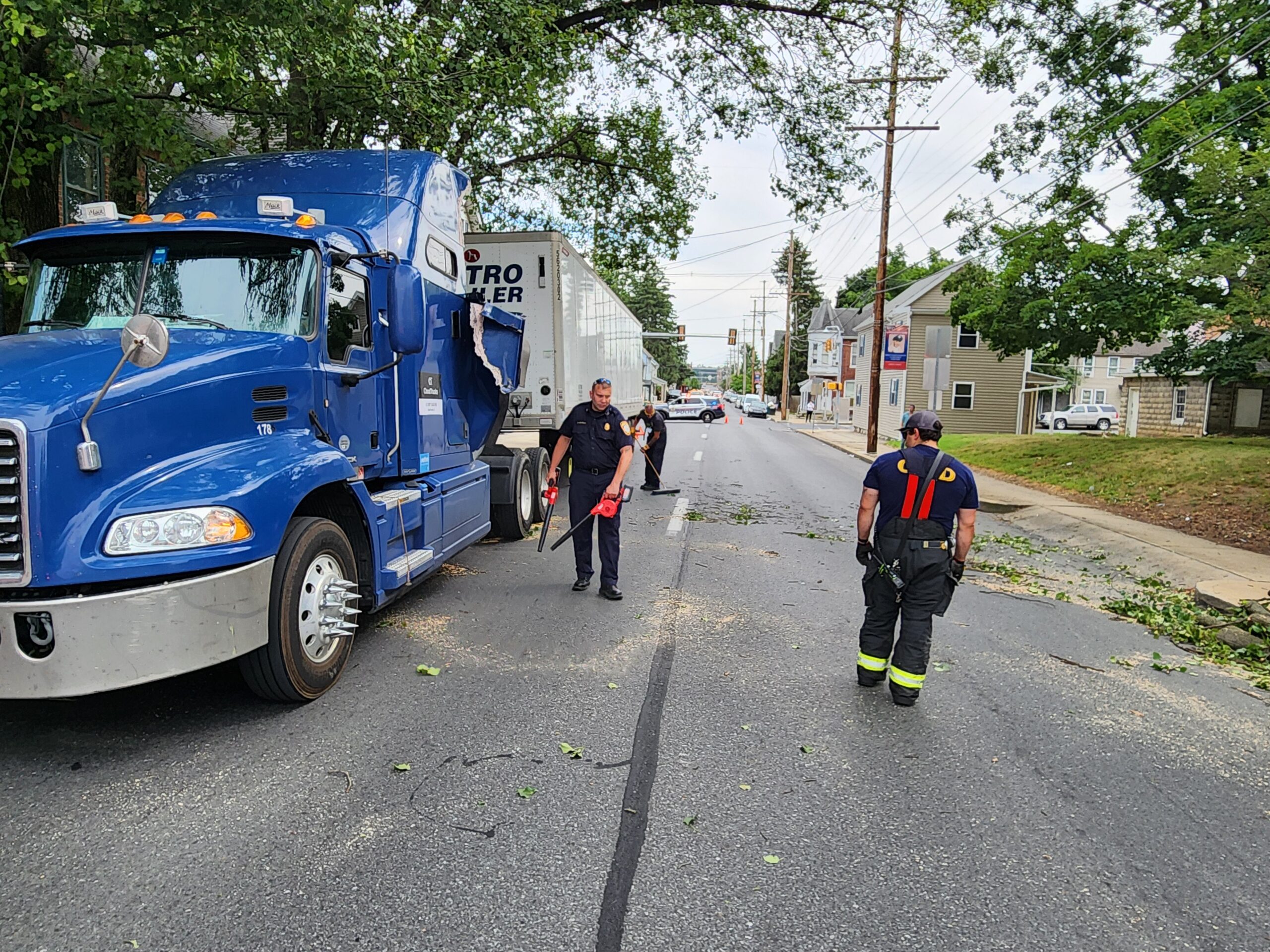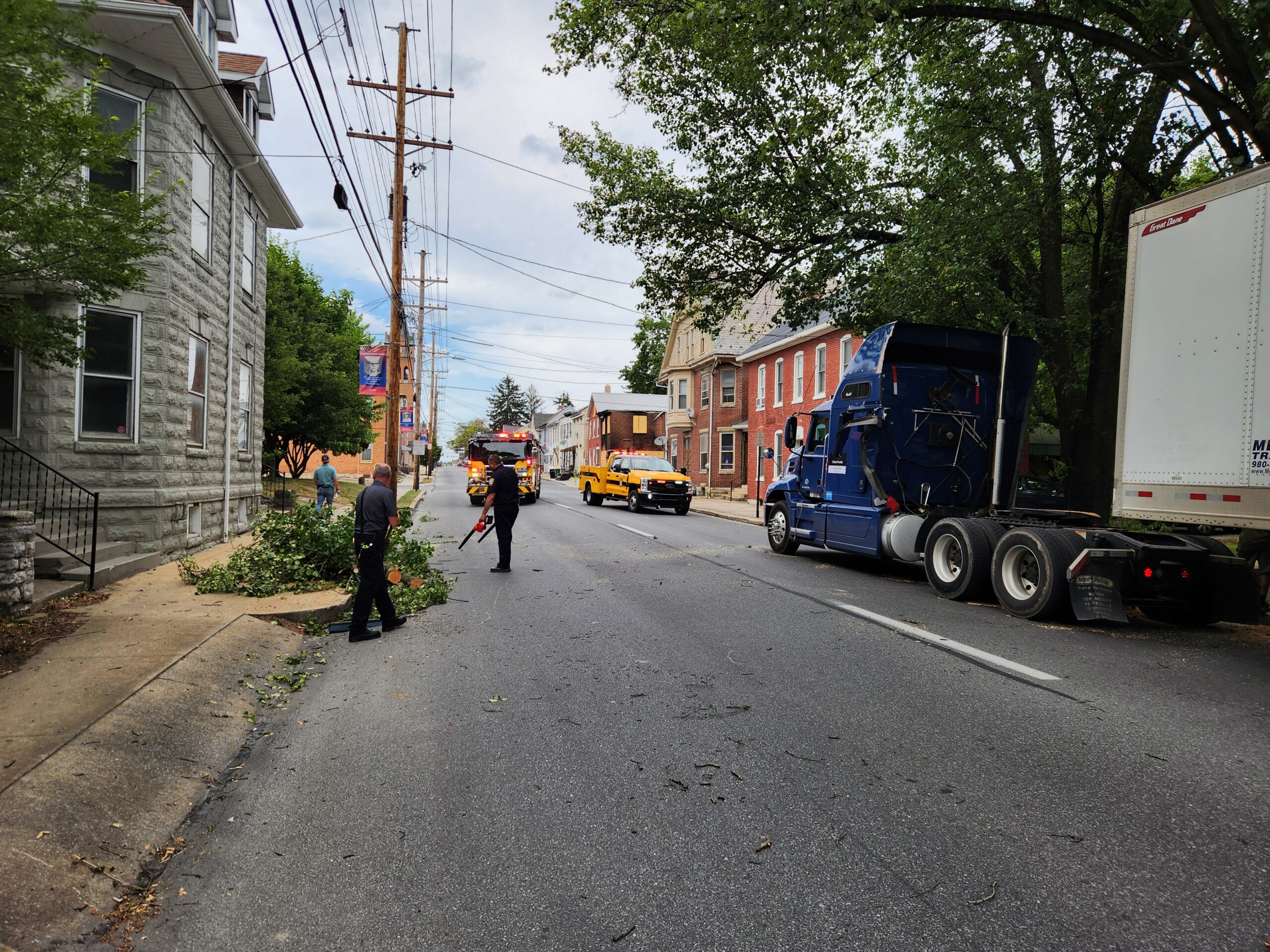 Company 1 FIre Police were sent to assist CPD with traffic control for a non-injury accident. Shortly after, Franklin County 911 sent Engine 1-1 and Utility 1 to assist with a tree down in the roadway. Units arrived, finding a tractor trailer that had a large tree branch come down, striking it and blocking 2nd Street. Crews utilized battery chainsaws from Engine 1-1 and the Utility to clear the tree from the roadway. Borough Road Crews arrived and removed the sections of the tree branch to clear the roadway. Crews operated on scene for about 30 minutes. While en route to this incident, Chief 1 came upon a tractor trailer on Catherine St. by 3rd St. that struck a power line and caused a power outage in the area. No services were needed and Borough Electric responded to make repairs.